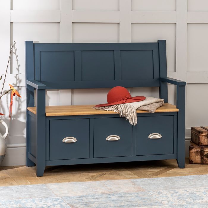 Westbury Blue Painted Monks Hall Bench With 3 Drawers The